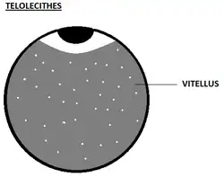 Les œufs des amphibiens sont mésolécithes. Les réserves vitellines y sont moyennement abondantes et réparties de manière hétérogène, plutôt au pôle végétatif qu'au pôle animal. Les divisions cellulaires sont ralenties au pôle végétatif par la quantité de vitellus.