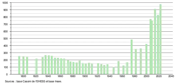 L'évolution du nombre d'habitants est connue à travers les recensements de la population effectués dans la commune depuis 1793. Pour les communes de moins de 10 000 habitants, une enquête de recensement portant sur toute la population est réalisée tous les cinq ans, les populations de référence des années intermédiaires étant quant à elles estimées par interpolation ou extrapolation[19]. Pour la commune, le premier recensement exhaustif entrant dans le cadre du nouveau dispositif a été réalisé en 2008[20].