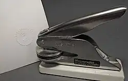 Dans les administrations, pour certifier un document, on a parfois recours à la pince à gaufrer, également appelée « pince à timbre sec » (et non « à sec »[3]) ou plus rarement, « pince à estamper » : dans le domaine de l'art, le résultat peut alors s'appeler une « estampille gaufrée », marquant l'authenticité d'un document imprimé, en l’occurrence ici une estampe.