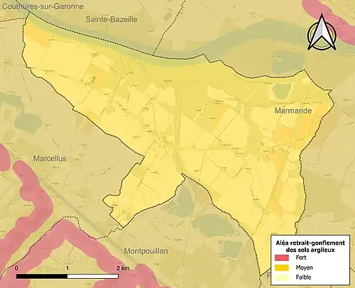Le retrait-gonflement des sols argileux est susceptible d'engendrer des dommages importants aux bâtiments en cas d’alternance de périodes de sécheresse et de pluie[21]. La totalité de la commune est en aléa moyen ou fort (91,8 % au niveau départemental et 48,5 % au niveau national)[Carte 2]. Depuis le , en application de la loi ELAN, différentes contraintes s'imposent aux vendeurs, maîtres d'ouvrages ou constructeurs de biens situés dans une zone classée en aléa moyen ou fort[Note 3],[22].