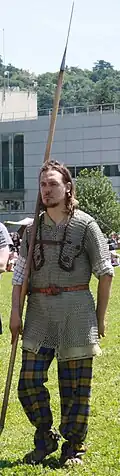 - Ce sont des combattants de métier, qui ne savent faire que la guerre. Bien souvent au service des aristocrates, ils sont soit des ambactos, soit des mercenaires, soit de jeunes aristocrates faisant leurs armes. Leur armement est plus adapté. Ils savent manier la lance, l'épée et le bouclier. Les ambactos sont équipés par leur maître. Ces hommes, suivant leur fortune ou celle de leur maître, peuvent porter la cotte de mailles, un casque et manier l'épée. Pour les plus riches, une cavalerie peut être constituée. Lors de victoires, le soldat prélève la tête de son ennemi en trophée qu'il place sur la porte de sa maison, le portique d'un sanctuaire ou dans un coffre en cèdre[57].