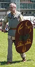 Enfin le bouclier : de forme ovale, d'environ 150 à 160 cm de haut et de 50 à 60 cm de large, il est en bois. Le détail de sa structure sera vu plus bas. Percé en son centre pour y placer la main, un manipule horizontal placé sur le centre de gravité permet une manipulation aisée d'une main de manière défensive comme offensive. Le plateau est renforcé par une spina en bois qui a aussi un rôle de protection de la main. Le tout est fixé et blindé par un umbo en fer et des rivets. (Voir photos)