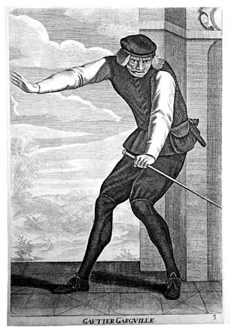 Les noms de Gautier et de Garguille sont attestés dans le lexique populaire avec « prendre Gautier pour Garguille » pour signifier « se méprendre » et avec « n’épargner ni Gautier ni Garguille » pour « n’épargner personne ». Clément de Dijon écrit en 1775 dans ses Anecdotes dramatiques[5] que « le langage populaire s’amusa à dédoubler le nom de ce personnage [Gautier Garguille] pour en opposer les deux parties. Or il semble plutôt que ce soit le contraire et qu’Huges Guéru a élaboré son nom de scène à partir d’une expression préexistante, car on lit déjà, en 1557, les vers suivants, sous la plume nom de Bonaventure Des Périers : « Riez seulement dit-il, et ne vous chaille, si ce fut Gaultier ou si ce fut Garguille ».