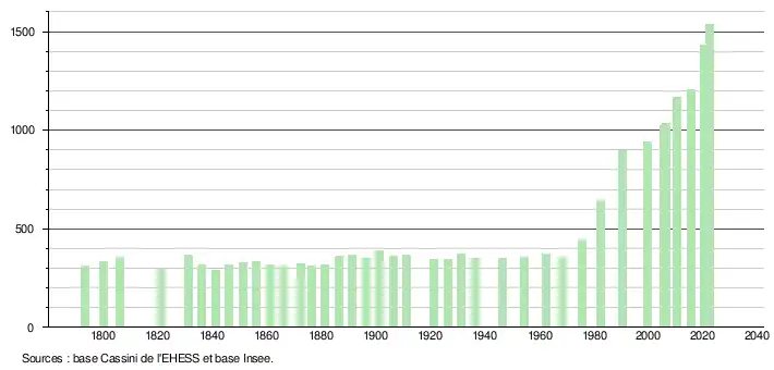 L'évolution du nombre d'habitants est connue à travers les recensements de la population effectués dans la commune depuis 1793. Pour les communes de moins de 10 000 habitants, une enquête de recensement portant sur toute la population est réalisée tous les cinq ans, les populations de référence des années intermédiaires étant quant à elles estimées par interpolation ou extrapolation[20]. Pour la commune, le premier recensement exhaustif entrant dans le cadre du nouveau dispositif a été réalisé en 2005[21].
