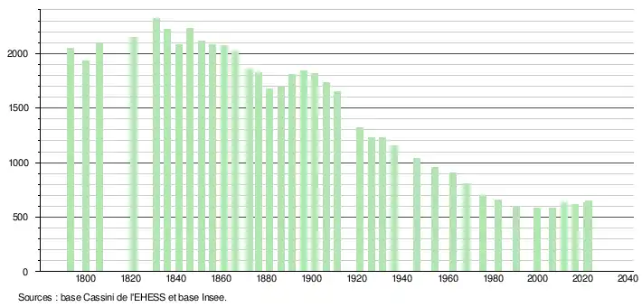 L'évolution du nombre d'habitants est connue à travers les recensements de la population effectués dans la commune depuis 1793. Pour les communes de moins de 10 000 habitants, une enquête de recensement portant sur toute la population est réalisée tous les cinq ans, les populations de référence des années intermédiaires étant quant à elles estimées par interpolation ou extrapolation[29]. Pour la commune, le premier recensement exhaustif entrant dans le cadre du nouveau dispositif a été réalisé en 2006[30].