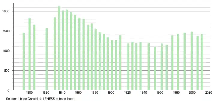 L'évolution du nombre d'habitants est connue à travers les recensements de la population effectués dans la commune depuis 1793. À partir du , les populations légales des communes sont publiées annuellement dans le cadre d'un recensement qui repose désormais sur une collecte d'information annuelle, concernant successivement tous les territoires communaux au cours d'une période de cinq ans. Pour les communes de moins de 10 000 habitants, une enquête de recensement portant sur toute la population est réalisée tous les cinq ans, les populations légales des années intermédiaires étant quant à elles estimées par interpolation ou extrapolation[25]. Pour la commune, le premier recensement exhaustif entrant dans le cadre du nouveau dispositif a été réalisé en 2007[26],[Note 2].