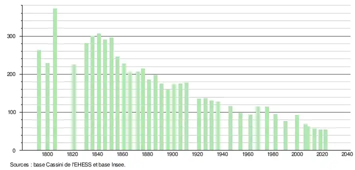 L'évolution du nombre d'habitants est connue à travers les recensements de la population effectués dans la commune depuis 1793. Pour les communes de moins de 10 000 habitants, une enquête de recensement portant sur toute la population est réalisée tous les cinq ans, les populations de référence des années intermédiaires étant quant à elles estimées par interpolation ou extrapolation[36]. Pour la commune, le premier recensement exhaustif entrant dans le cadre du nouveau dispositif a été réalisé en 2008[37].