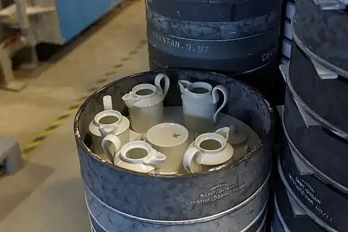 Dans les fours à porcelaine européens du XIXe siècle, les gazettes sont des étuis de forme cylindrique en terre cuite réfractaire. Ces étuis s'empilent les uns sur les autres et contiennent, séparées par des rondeaux ou supportées par des pernettes, les pièces des futures porcelaines ayant subi leur première cuisson à 900 °C. Rondeaux et gazettes protègent des flammes et des retombées de cendres les objets soumis à une deuxième cuisson de grand feu à 1 380 °C[2]. Dans un four comme le four de Casseaux de Limoges, monument historique, les masses enfournées peuvent être considérables : 5 tonnes de porcelaine et 35 tonnes de gazettes.