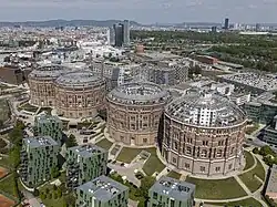 Vienne a entrepris une réhabilitation du site et fit appel en 1995 à un concours d'architecture afin de donner une nouvelle affectation aux gazomètres. Les projets retenus furent ceux des architectes Jean Nouvel (Gazomètre A), Coop-Himmelb(l)au (Gazomètre B), Manfred Wehdorn (Gazomètre C) et Wilhelm Holzbauer (Gazomètre D) et furent réalisés entre 1999 et 2001. Chaque gazomètre a été divisé en plusieurs zones : des appartements dans la partie supérieure (la zone de vie), des bureaux aux étages (la zone de travail) et des centres commerciaux au rez-de-chaussée (la zone de divertissement et de commerce). Les niveaux des centres commerciaux sont reliés entre eux par des passerelles. Le mur extérieur a gardé son caractère historique et a été conservé dans son état d'origine.