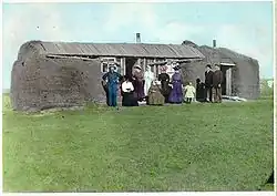 En Amérique du Nord, il était initialement principalement utilisé pour les abris des animaux, les enclos et les clôtures, notamment lorsque la prairie manquait de matériaux de construction standard tels que le bois ou la pierre. En effet, l'herbe des grandes plaines aux racines épaisses et profondes était abondante, gratuite et pouvait être utilisée pour la construction de maisons[2]. L'herbe des prairies a une structure racinaire beaucoup plus épaisse et plus résistante qu'une pelouse moderne. Le scalpage de la pelouse avait le double avantage de permettre d'accéder à un sol arable permettant la culture de subsistance des colons.