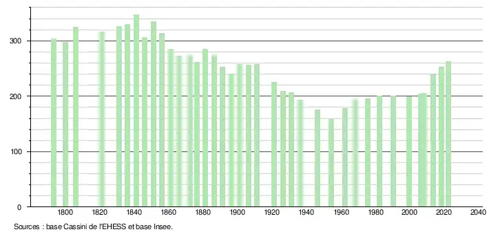 L'évolution du nombre d'habitants est connue à travers les recensements de la population effectués dans la commune depuis 1793. Pour les communes de moins de 10 000 habitants, une enquête de recensement portant sur toute la population est réalisée tous les cinq ans, les populations de référence des années intermédiaires étant quant à elles estimées par interpolation ou extrapolation[37]. Pour la commune, le premier recensement exhaustif entrant dans le cadre du nouveau dispositif a été réalisé en 2008[38].