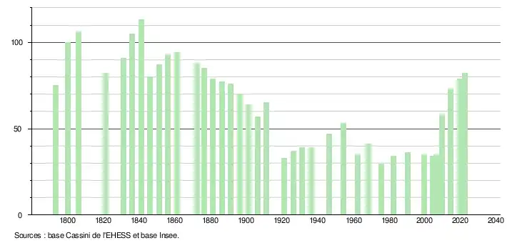 - ↑ Population municipale de référence en vigueur au 1er janvier 2025, millésimée 2022, définie dans les limites territoriales en vigueur au 1er janvier 2024, date de référence statistique : 1er janvier 2022.
