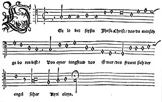 La mélodie fut publiée pour la première fois avec le texte en 1524, mais elle apparaît également dans les livres de prières du couvent de Medingen. Il est probable que Luther et Walter aient travaillé de concert pour modifier une vieille mélodie. La mélodie accentue les mots plus importants de la première strophe, tel Jesu, Mensch (homme), Jungfrau (vierge) et Engel (anges).