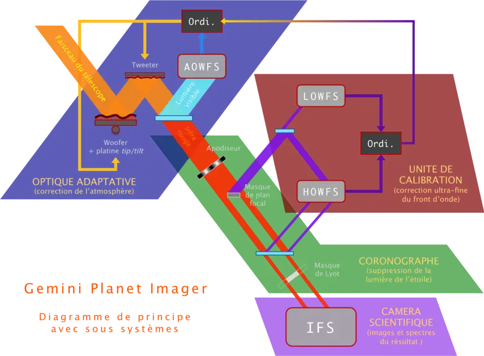 Pour remplir son objectif, l’instrument embarque un système d’optique adaptative extrême, un coronographe de Lyot apodisé, une unité de calibration basée sur un interféromètre et un spectrographe intégral de champ. Avant d'envoyer le GPI à Gemini Sud, il était essentiel de tester le coronographe en reproduisant les conditions expérimentales exactes dans lesquelles il allait être employé. La source de laser accordable de Photon etc. a été utilisée à cet effet et a permis de déterminer que, à son pic d'efficacité, l'imageur peut détecter une planète à peine plus massive que Jupiter[1]. L’optique adaptative, développée et construite au LLNL, utilise deux miroirs déformables pour corriger les aberrations induites par l’atmosphère et les optiques du télescope. Le premier, fourni par la société CILAS, utilise des actuateurs piézoélectriques et une platine tip-tilt pour compenser les basses fréquences spatiales tandis que le second, de type MEMS et fourni par Boston Micromachines, prend le relais pour les hautes fréquences. L’unité de calibration mise en place par le JPL permet de mesurer les erreurs résiduelles quasi-statiques non perçues par l’optique adaptative afin d’indiquer à cette dernière les compensations à réaliser pendant les acquisitions. Elle comprend deux analyseurs de surface d’onde : un Shack-Hartmann bas ordres et un interféromètre de Mach-Zehnder modifié pour les hauts ordres. Le coronographe, développé par l’AMNH, sert à bloquer la lumière de l’étoile hôte pour pouvoir distinguer le compagnon faiblement lumineux que constitue la cible scientifique. Enfin, la caméra scientifique de GPI est un spectrographe conçu par les universités de Montréal et de Californie (Los Angeles) qui délivre après post-processing un cube de données contenant une image pour chaque longueur d'onde de la bande d’observation avec une résolution d’environ 50 (bande H) sur un champ de vue de 2,8 secondes d’arc carrées. Il est aussi possible de travailler en polarisation en remplaçant le prisme dispersif par un prisme de Wollaston.
