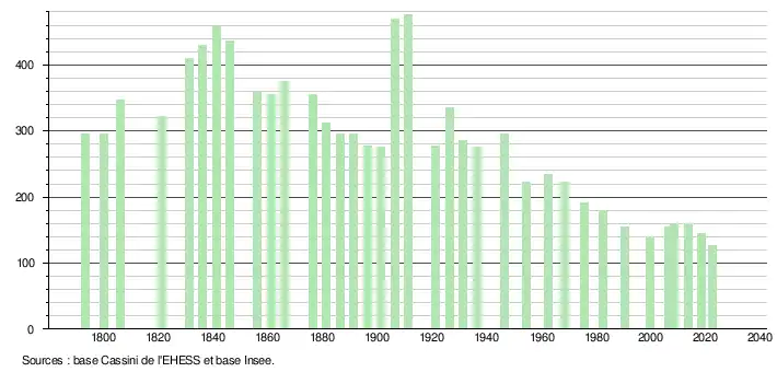 L'évolution du nombre d'habitants est connue à travers les recensements de la population effectués dans la commune depuis 1793. Pour les communes de moins de 10 000 habitants, une enquête de recensement portant sur toute la population est réalisée tous les cinq ans, les populations de référence des années intermédiaires étant quant à elles estimées par interpolation ou extrapolation[30]. Pour la commune, le premier recensement exhaustif entrant dans le cadre du nouveau dispositif a été réalisé en 2008[31].