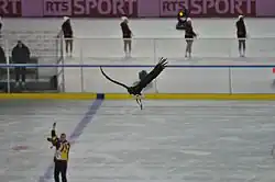 Sherkan a été sélectionné pour sa capacité à supporter l’environnement particulièrement bruyant et agité d’une patinoire de plus de 7 000 spectateurs. Il suit un entraînement intensif qui doit lui permettre d’effectuer un vol ascensionnel malgré l’air froid qui règne au-dessus de la glace et qui le prive de tout courant ascendant[13].