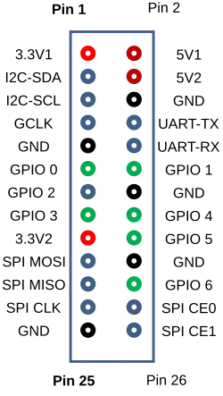 Un connecteur GPIO est généralement alimenté en 3,3 Vcc et ne peut émettre que des courants de faible intensité, allant de 3 mA à 50 mA[21].