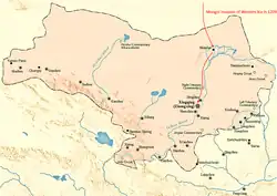 Dès 1205, les Mongols commencent à harceler les colonies frontalières du royaume des Xia occidentaux dirigé par les Tangoutes, apparemment en représailles pour avoir permis à Senggum, le fils de Toghril, d'y trouver refuge[150],[151]. Des explications plus prosaïques incluent le rajeunissement de l'économie mongole épuisée par un afflux de produits frais et de bétail[152],[118], ou simplement la soumission d'un État semi-hostile pour protéger la nation mongole naissante[153],[154]. La plupart des troupes Xia sont stationnées le long des frontières sud et est du royaume pour se protéger des attaques des dynasties Song et Jin respectivement, tandis que sa frontière nord ne compte que sur le désert de Gobi pour sa protection[155],[156]. Après un raid en 1207 qui met à sac la forteresse Xia de Wulahai, Gengis Khan décide de mener personnellement une invasion à grande échelle en 1209[157],[158].