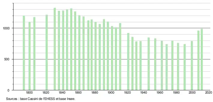 - ↑ Dans le tableau des recensements et le graphique, par convention dans Wikipédia, le principe a été retenu, pour les populations légales postérieures à 1999 de n’afficher dans le tableau des recensements et le graphique que les populations correspondant à l'année 2006, première population légale publiée calculée conformément aux concepts définis dans le décret no 2003-485 du 5 juin 2003, et les années correspondant à une enquête exhaustive de recensement pour les communes de moins de 10 000 habitants, ainsi que la dernière population légale publiée par l’Insee.