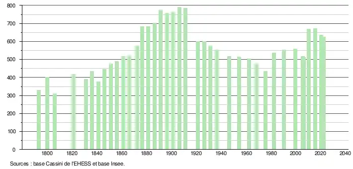 L'évolution du nombre d'habitants est connue à travers les recensements de la population effectués dans la commune depuis 1793. Pour les communes de moins de 10 000 habitants, une enquête de recensement portant sur toute la population est réalisée tous les cinq ans, les populations de référence des années intermédiaires étant quant à elles estimées par interpolation ou extrapolation[15]. Pour la commune, le premier recensement exhaustif entrant dans le cadre du nouveau dispositif a été réalisé en 2005[16].