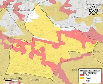 Le retrait-gonflement des sols argileux est susceptible d'engendrer des dommages importants aux bâtiments en cas d’alternance de périodes de sécheresse et de pluie. 94,6 % de la superficie communale est en aléa moyen ou fort (54,2 % au niveau départemental et 48,5 % au niveau national). Sur les 416 bâtiments dénombrés sur la commune en 2019, 405 sont en aléa moyen ou fort, soit 97 %, à comparer aux 57 % au niveau départemental et 54 % au niveau national. Une cartographie de l'exposition du territoire national au retrait gonflement des sols argileux est disponible sur le site du BRGM[12],[Carte 2].