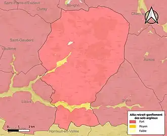 Les mouvements de terrains susceptibles de se produire sur la commune sont des affaissements et effondrements liés aux cavités souterraines (hors mines) et des tassements différentiels[17]. Afin de mieux appréhender le risque d’affaissement de terrain, un inventaire national permet de localiser les éventuelles cavités souterraines sur la commune[18]. Le retrait-gonflement des sols argileux est susceptible d'engendrer des dommages importants aux bâtiments en cas d’alternance de périodes de sécheresse et de pluie[19]. 99,9 % de la superficie communale est en aléa moyen ou fort (79,5 % au niveau départemental et 48,5 % au niveau national)[Carte 2]. Depuis le , en application de la loi ÉLAN, différentes contraintes s'imposent aux vendeurs, maîtres d'ouvrages ou constructeurs de biens situés dans une zone classée en aléa moyen ou fort[Note 1],[20].