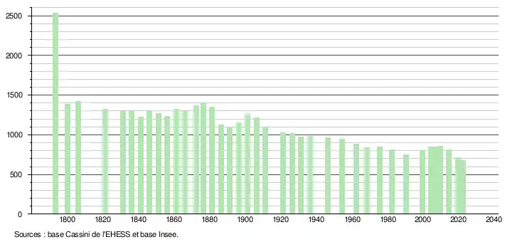En 2022, la commune comptait 679 habitants[Note 2], en évolution de −15,12 % par rapport à 2016 (Gironde : +6,91 %, France hors Mayotte : +2,11 %).