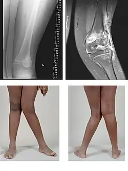 - ↑ « A clinical and biochemical study of chronic fluoride toxicity in children of Kheru Thanda of Gulbarga district, Karnataka, India » : « Radiographic changes suggestive of osteoporosis, osteosclerosis, and genu valgum was observed. Major skeletal manifestations observed in various studies of fluorosis are bowed legs(genu varum) or knock-knee (genu valgum), and stiffness of the cervical andlumbar spine.Our study also revealed skeletal fluorosis with cripplingbone deformities »