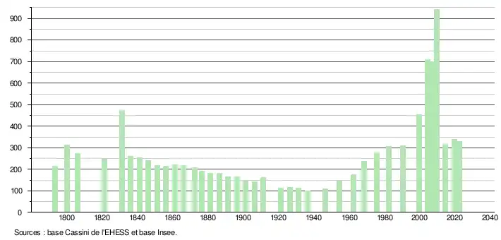 L'évolution du nombre d'habitants est connue à travers les recensements de la population effectués dans la commune depuis 1793. Pour les communes de moins de 10 000 habitants, une enquête de recensement portant sur toute la population est réalisée tous les cinq ans, les populations de référence des années intermédiaires étant quant à elles estimées par interpolation ou extrapolation[23]. Pour la commune, le premier recensement exhaustif entrant dans le cadre du nouveau dispositif a été réalisé en 2004[24].