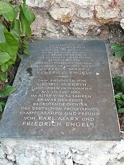 Georg Weerth décède le à l'âge de 34 ans à La Havane. Dans le quartier de Cayo Hueso, une stèle commémorative est dressée en 1974 sur un mur de la Calle Aramburu – le dernier vestige de l'ancien cimetière d'Espada – en la mémoire de Georg Weerth[6],[7]. Ses effets personnels et manuscrits sont répartis dans trois lieux. Ses principaux manuscrits sont conservés au Internationaal Instituut voor Sociale Geschiedenis d'Amsterdam. Les deux caisses dans lesquelles ils contenaient furent achetées en 1936 pour 5000 marks. Une partie des manuscrits originaux est conservée à l'institut Marx-Engels-Lénine (en) de Moscou. Ces derniers furent acquis par un amateur dans les années 1920. Enfin, la Lippischen Landesbibliothek de Detmold, la ville natale de Georg Weerth, complète les poèmes de la main de Georg Weerth et des exemplaires d'auteur de la Nouvelle Gazette rhénane par des centaines de lettres qu'elle tient à la disposition du public[8].