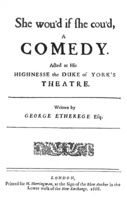 Quatre ans plus tard, Etherege écrit en 1668 la comédie She Would If She Could [Elle le ferait si elle le pouvait] et la fait jouer le au théâtre de Dorset Garden à Londres. La pièce attire un très grand nombre de spectateurs mais ne connaît qu'un succès honorable, en raison d'un jeu médiocre des acteurs[10]. Dans cette comédie, Etherege revendique la multiplicité des intrigues : « Une intrigue unique en amour est aussi ennuyeuse qu'une intrigue unique au théâtre. La première ennuiera encore plus un amant que la seconde un public »[N 3].