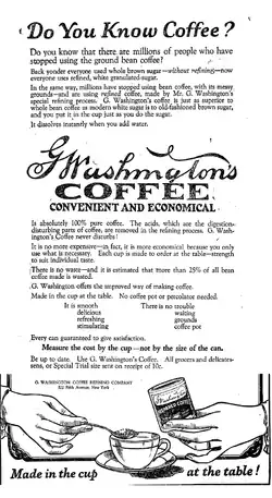 Les publicités sur son café instantané mettaient surtout l'accent sur son côté pratique, sa modernité et sa pureté. Il était censé faciliter la digestion et on disait même que ce café « pur » n'avait pas l'effet insomniant du café moulu. Il expliquait dans ses publicités que son procédé de fabrication n'extrayait pas les « acides » alors qu'on savait depuis 1819 que le pouvoir stimulant du café est dû à une base xanthique, la caféine, qui est évidemment extraite par le procédé de Washington.