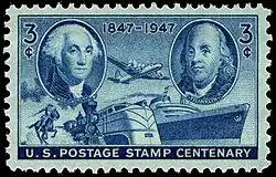 - ↑ Timbre pour le 100e anniversaire des premiers timbres-poste des États-Unis. Les portraits de George Washington et de Benjamin Franklin sont respectivement à gauche et à droite : ce sont les mêmes portraits utilisés sur les timbres de 1847.