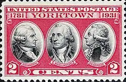 | 1931 | 2¢ rouge « Battle of Yorktown » | Au-dessus « UNITED STATES POSTAGE 1781 Yorktown 1931 » en dessous « ROCHAMBEAU WASHINGTON DEGRASSE 2 CENTS 2 » | Dentelé | ![]() | Bureau of Engraving and Printing | [note 10] | |