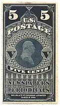 | 1865-1875 | 5¢ noir « newspapers&periodicals postage » | Au-dessus « 5 U.S. POSTAGE 5 » en dessous « FIVE CENTS NEWSPAPERS PERIODICALS » | Dentelé | ![]() | |||