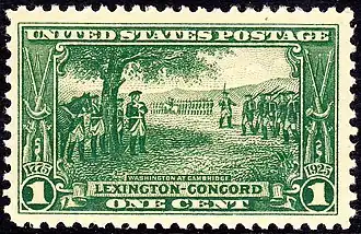 | 1925 | 1¢ « Lexington et Concord » | Au-dessus « UNITED STATES POSTAGE » en dessous « 1 LEXINGTON CONCORD 1 ONE CENT » | Dentelé | ![]() | Bureau of Engraving and Printing | [note 8] | |