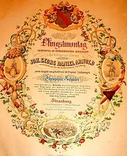 - ↑ Der Pfingstmontag. Lustspiel in Strassburger Mundart in fuenf Aufzuegen und in Versen. Nebst einem die eigenthuemlichen einheimischen Ausdruecke erklaerenden Wœrterbuche, Treutel und Würtz, Strassburg, 1816, 199 p.