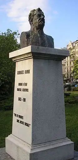 - ↑ Le buste est de Rodo. Il a été érigé à cet emplacement, au bout de la plaine de Plainpalais, à l'occasion du 50e anniversaire de la mort de Favon, en 1952. Ceci selon un article du Journal de Genève du .