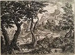 - Paysage animé de deux personnages marchant sur la droite, plume, encre brune. H. 0,258 ; L. 0,349 m[8]. Paris, Beaux-Arts de Paris.