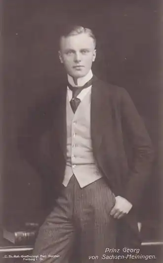 Son grand-père, le duc Georges II de Saxe-Meiningen-Hildburghausen s'éteint le , trois jours avant l'Attentat de Sarajevo qui provoquera un mois plus tard la Première Guerre mondiale. L'oncle du prince Georges devient duc régnant sous le nom de Bernard III de Saxe-Meiningen. Celui-ci avait épousé en 1879 la princesse Charlotte de Prusse et était le beau-frère du Kaiser Guillaume II. Le prince Georges est considéré comme l'héritier du trône. Le , alors que la guerre éclate, son autre sœur, la princesse Adélaïde de Saxe-Meiningen épouse le prince Adalbert de Prusse, fils cadet du Kaiser et officier de marine.