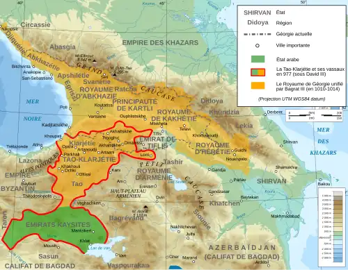 Georges Ier, encore jeune et fier de ses quelques exploits, décide de raviver les anciennes tensions entre sa nation et l'Empire byzantin, qui connaît des poussées impérialistes dans cette région du Caucase depuis au moins le règne de Justinien (527-565). De plus, il se considère véritablement comme le successeur de celui qui tenta d'unifier les terres géorgiennes, et la perte de la Kakhétie et de l'Héréthie l'entraîne à chercher de nouveaux domaines au sud-ouest[17]. C'est ainsi qu'il pense au Tao, ancien Royaume des Géorgiens et domaine héréditaire des premiers Bagrations, qui avait été légué par testament au Basileus Basile II par David le Curopalate, comme terme d'une punition en raison du soutien de ce dernier pour le rebelle Bardas Phocas, et dont une partie fut offerte par Constantinople à Bagrat III.