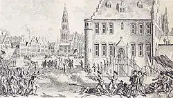 Dans la soirée du 2 mars, Rennenberg est apparu sur le Breede Merckt, le Grand Marché de Groningue, où il s'est adressé aux habitants. Il a soutenu que jusque-là, il avait cru que les protestants luttaient pour une bonne réforme du christianisme, mais maintenant, ils recherchaient un pouvoir laïque sous le couvert de la foi. Lorsqu'au moment de son discours, il a demandé leur aide aux gens, toutes les personnes présentes l'ont acclamé. Le gouverneur a ensuite délibéré toute la nuit et a élaboré une ruse pour prendre l'avantage sur les protestants: au lieu de six heures, l'horloge sonnerait cinq heures du matin et avec elle, sonneraient des trompettes. À ce signe, tout le monde devait récupérer avec son fusil sur le marché[2] puis, les conspirateurs protestants seraient arrêtés et les portes de la ville fermées contre les soldats de l'armée de l'État qui attendait hors les murs sous les ordres de Bartold Entens.