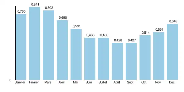Les fluctuations saisonnières, sans être chiffrées, peuvent ressembler à celles de la Thérouanne, sa rivière sœur, représentées ici :