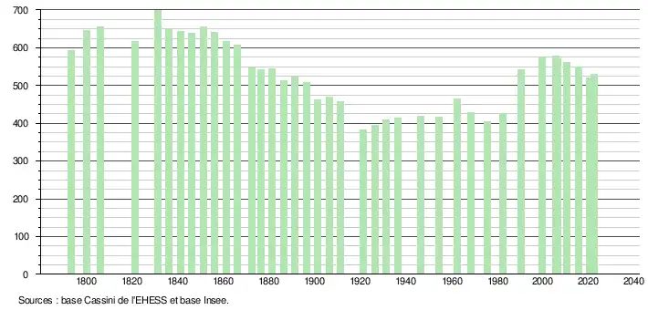 L'évolution du nombre d'habitants est connue à travers les recensements de la population effectués dans la commune depuis 1793. Pour les communes de moins de 10 000 habitants, une enquête de recensement portant sur toute la population est réalisée tous les cinq ans, les populations de référence des années intermédiaires étant quant à elles estimées par interpolation ou extrapolation[14]. Pour la commune, le premier recensement exhaustif entrant dans le cadre du nouveau dispositif a été réalisé en 2005[15].