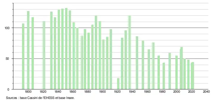 L'évolution du nombre d'habitants est connue à travers les recensements de la population effectués dans la commune depuis 1793. Pour les communes de moins de 10 000 habitants, une enquête de recensement portant sur toute la population est réalisée tous les cinq ans, les populations de référence des années intermédiaires étant quant à elles estimées par interpolation ou extrapolation[7]. Pour la commune, le premier recensement exhaustif entrant dans le cadre du nouveau dispositif a été réalisé en 2005[8].