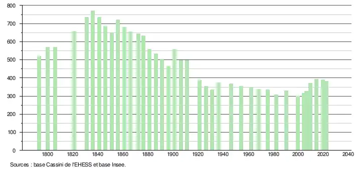 L'évolution du nombre d'habitants est connue à travers les recensements de la population effectués dans la commune depuis 1793. Pour les communes de moins de 10 000 habitants, une enquête de recensement portant sur toute la population est réalisée tous les cinq ans, les populations de référence des années intermédiaires étant quant à elles estimées par interpolation ou extrapolation[28]. Pour la commune, le premier recensement exhaustif entrant dans le cadre du nouveau dispositif a été réalisé en 2004[29].