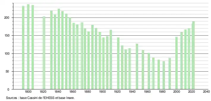 L'évolution du nombre d'habitants est connue à travers les recensements de la population effectués dans la commune depuis 1793. Pour les communes de moins de 10 000 habitants, une enquête de recensement portant sur toute la population est réalisée tous les cinq ans, les populations de référence des années intermédiaires étant quant à elles estimées par interpolation ou extrapolation[14]. Pour la commune, le premier recensement exhaustif entrant dans le cadre du nouveau dispositif a été réalisé en 2006[15].