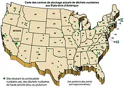 De très nombreux sites de stockage en surface pour déchets de faible activité sont en exploitation aux États-Unis (voir carte). Le premier et le plus ancien site de stockage de déchets solides ou liquides est le site de Hanford.