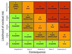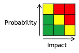 Exemple d'une évaluation qualitative des risques, typique d'une gestion de projet : classement par classe d'impact et classe de probabilité (ici en cinq classes).