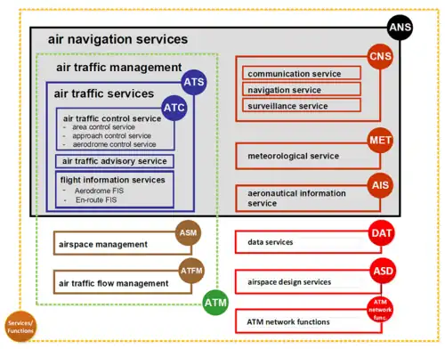 - les Services de la circulation aérienne ou ATS (Air Traffic Services), qui comprend entre autres le contrôle aérien, est majoritairement géré par des organismes nationaux (militaires, publics ou privés) ;